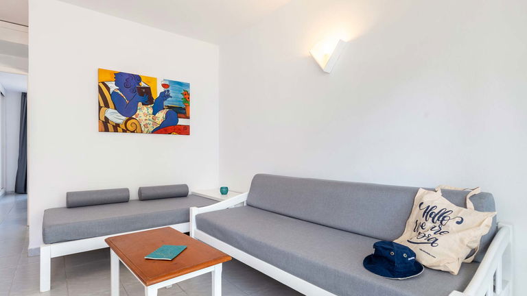 Mit einem Design voller mediterraner Vibes und einem Schlafzimmer mit zwei Einzelbetten, Wohnzimmer mit Schlafsofa, ausgestatteter Kochnische, Kühlschrank, Mikrowelle, Fernseher, Klimaanlage, kostenlosem WLAN, renoviertem Badezimmer mit Dusche sowie Balkon oder Terrasse mit Aussicht.