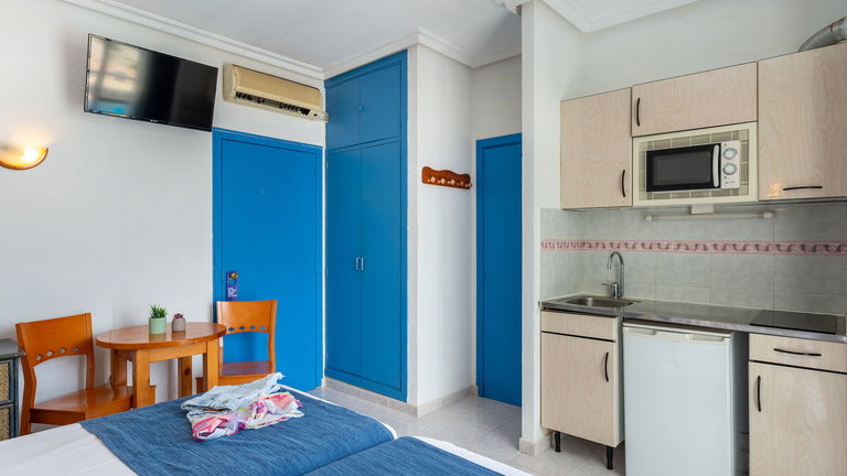All the studios are equipped with air conditioning, full bathroom, satellite TV, safe, kitchenette, fridge, microwave and some of balcony.