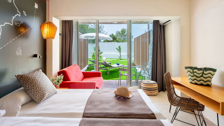 This room is the perfect size for families. It has a large terrace with two deck chairs and a parasol. Rooms with air conditioning, complete bathroom, satellite TV, telephone and balcony.