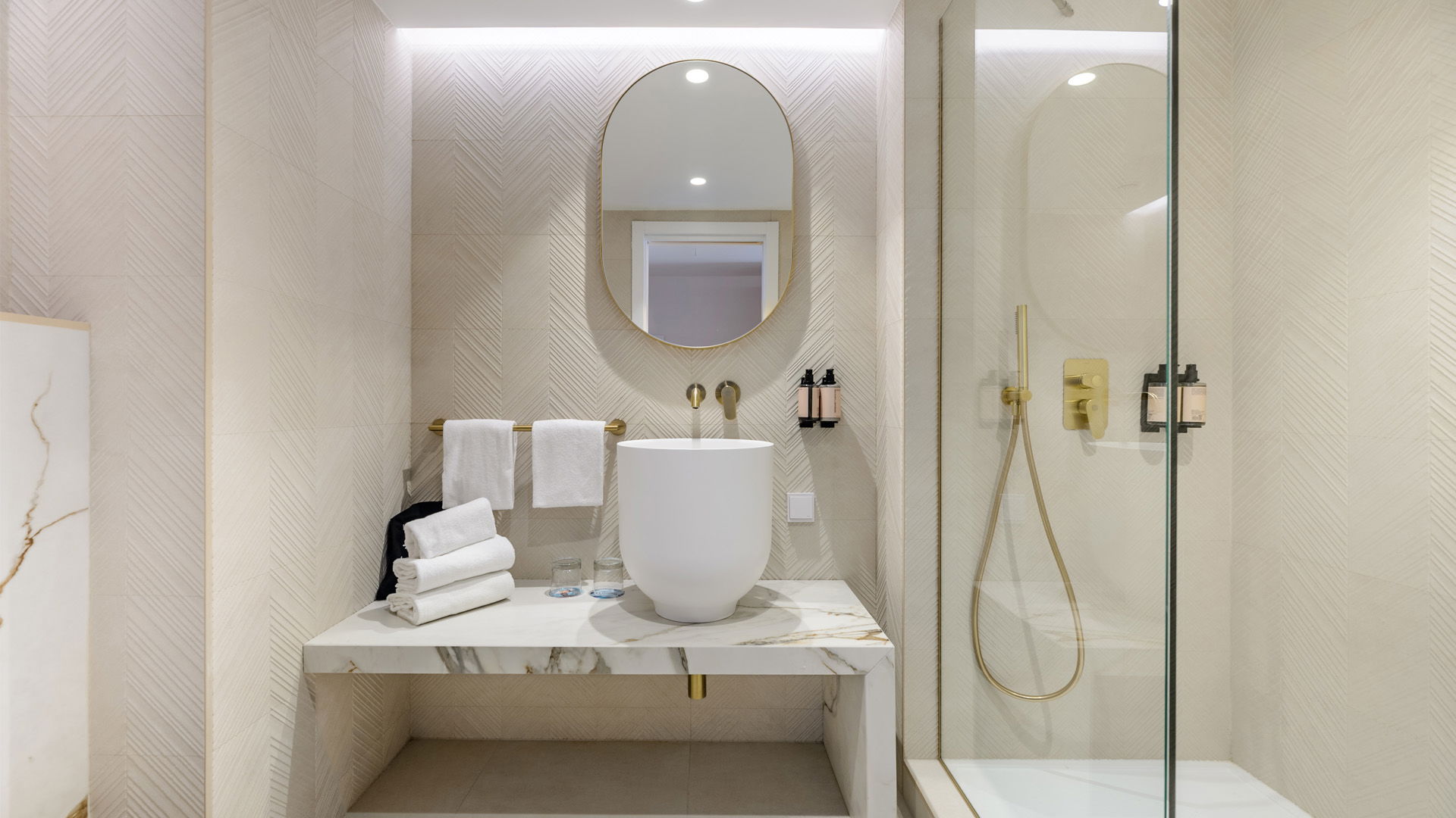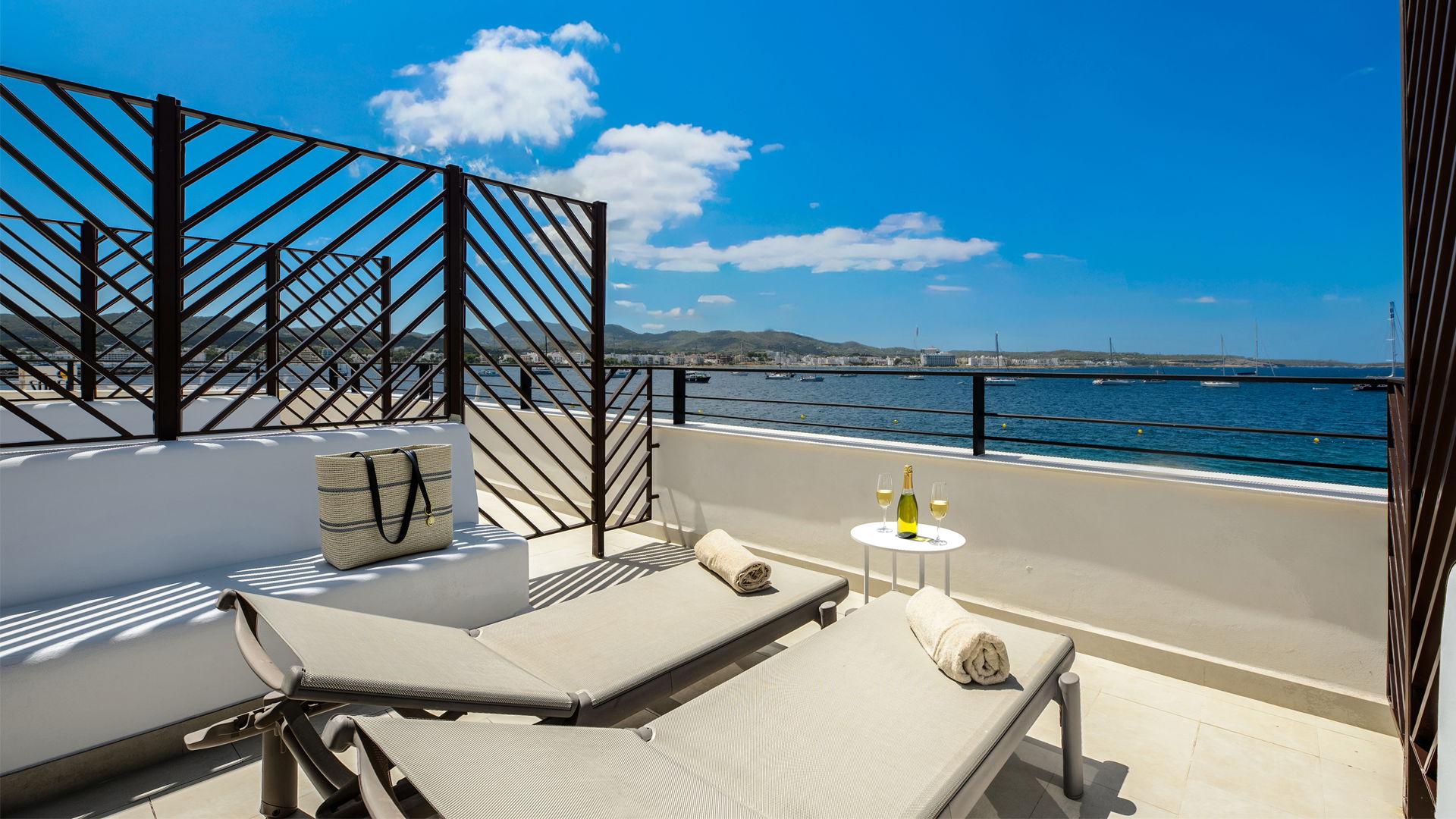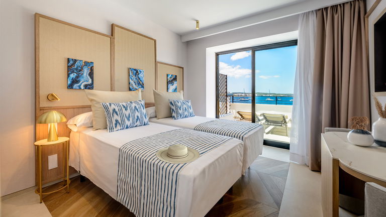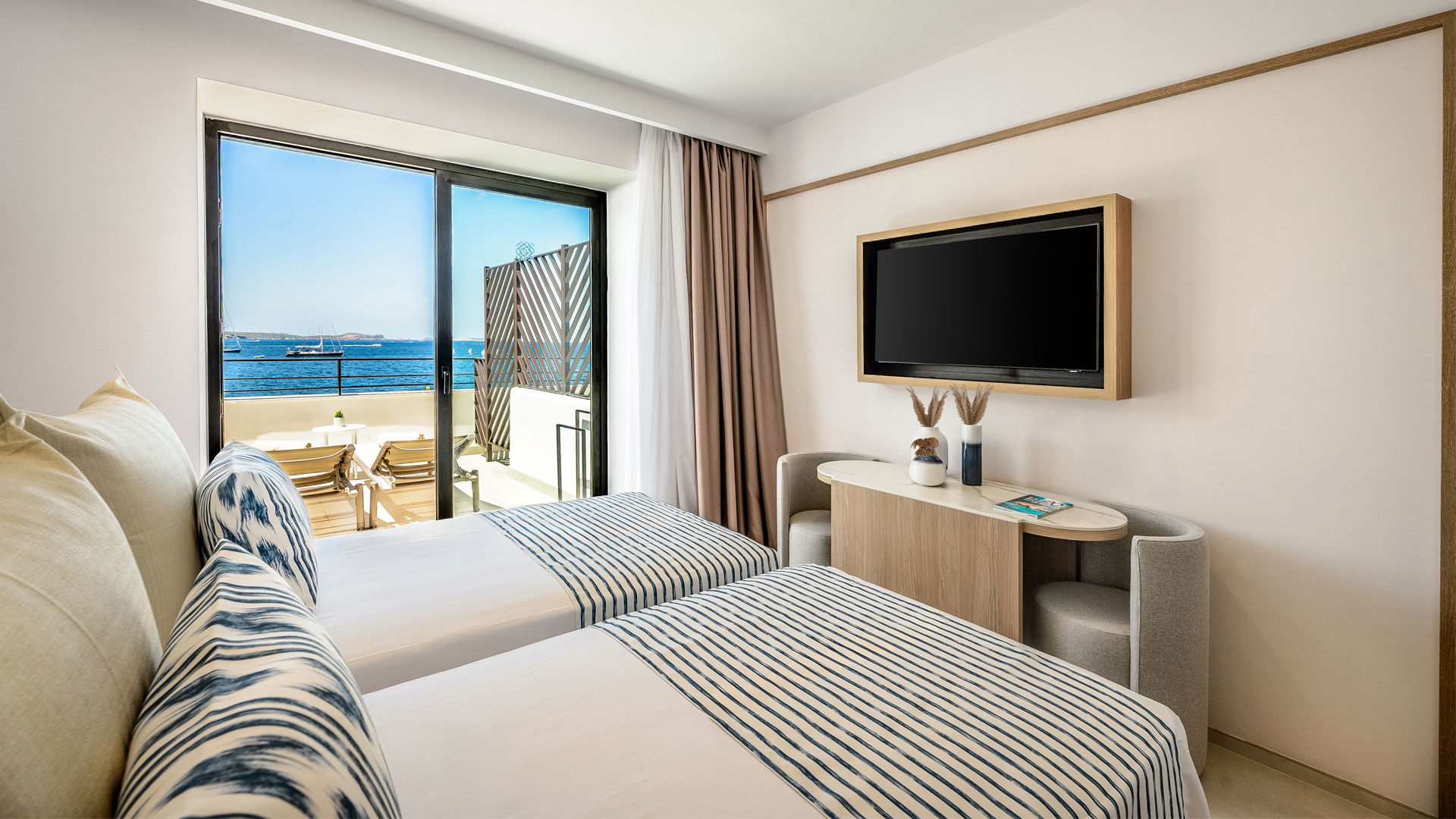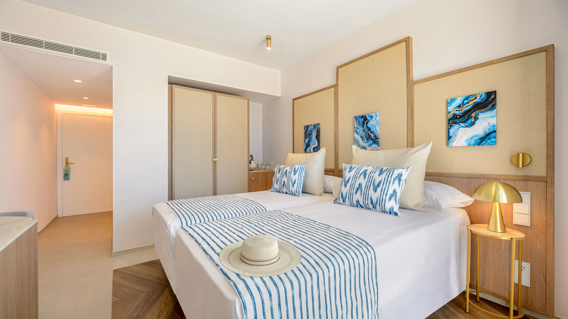 The twin room features a fully equipped bathroom with shower, hairdryer, air conditioning, telephone, satellite TV, safe, Wi-Fi, minibar, and a terrace with spectacular sea views where you can enjoy the island's wonderful sunsets.