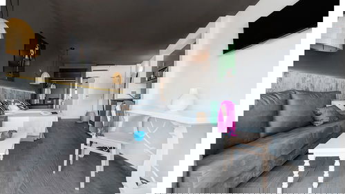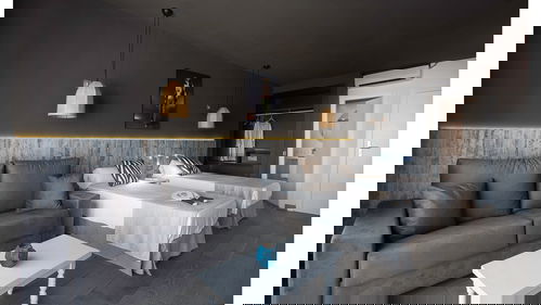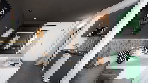 Studio with kitchenette, refrigerator, Kitchenware, microwave, full bathroom, air conditioning, satellite TV, sitting area and balcony.
