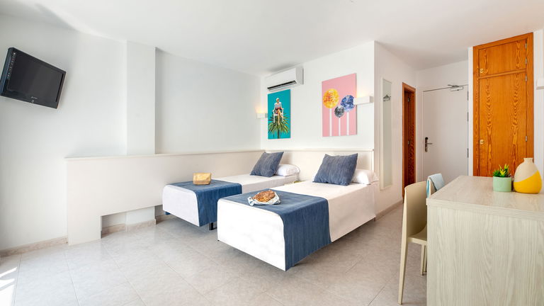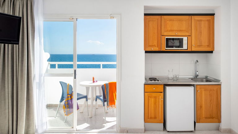 Los estudios están equipados con dos camas individuales, aire acondicionado, TV vía satélite, baño completo, kitchenette, mini-nevera, teléfono y balcón con vistas al mar.
