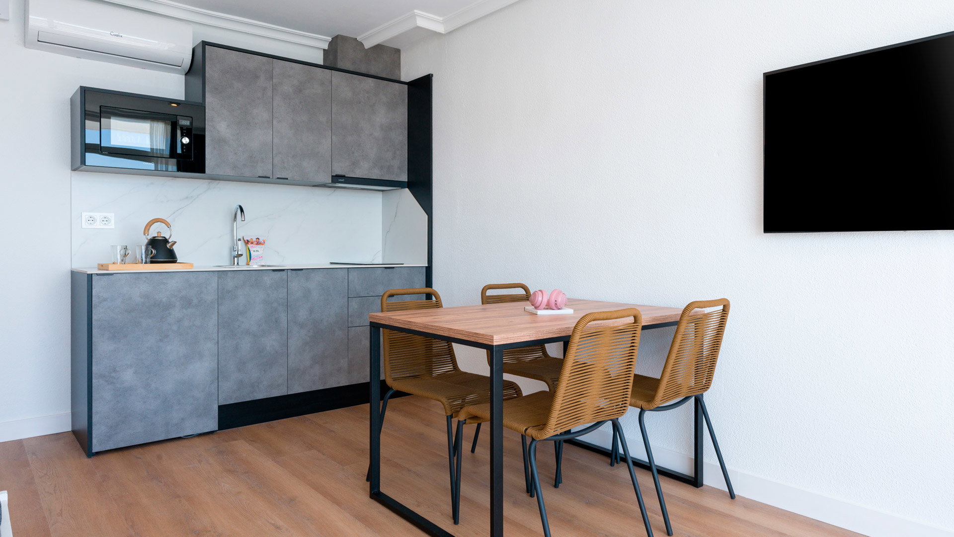 Apartamento de un dormitorio y salón con kitchenette y mini- nevera, microondas, baño completo, aire acondicionado, baño completo, teléfono, TV vía satélite y balcón con vistas al mar, Dalt Vila o Playa den Bossa