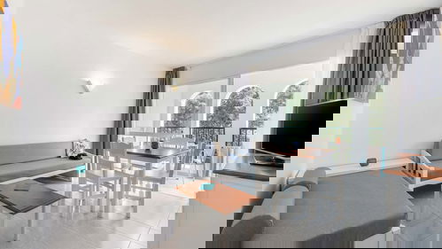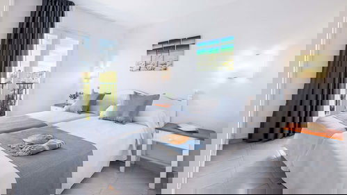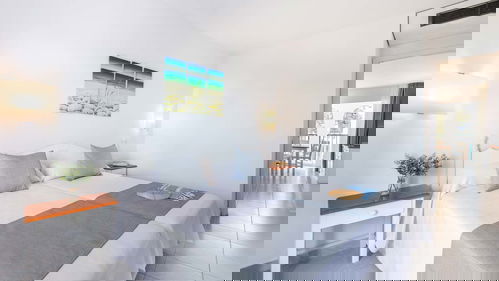 Avec un design plein d'ambiance méditerranéenne et une chambre avec deux lits simples, un salon avec canapé-lit, une kitchenette équipée, un réfrigérateur, un four micro-ondes, une télévision, la climatisation, une connexion Wi-Fi gratuite, une salle de bain rénovée avec douche et un balcon ou une terrasse avec vue.