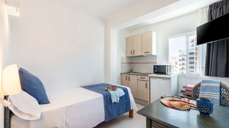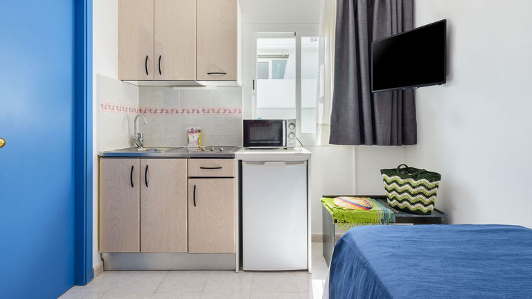 Single Studio uitgerust met airconditioning, magnetron, veilig, satelliet-tv, Telefoon, complete badkamer, een kitchenette en koelkast.