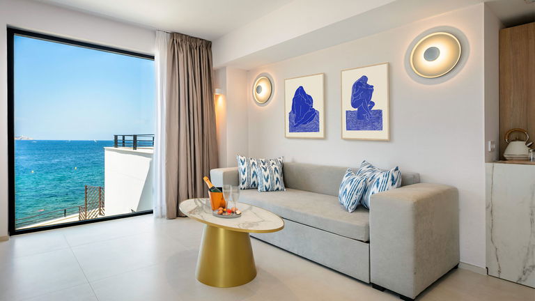 Suite heeft een kleine woonkamer, airconditioning, een complete badkamer, douche, haardroger, satelliet TV, telefoon, een kluis, wifi, minibar en uitzicht op zee. Heeft geen balkon.