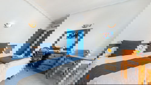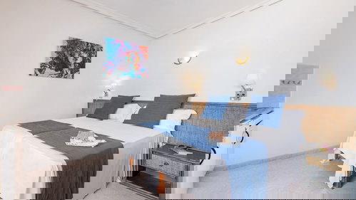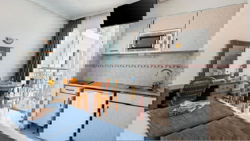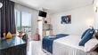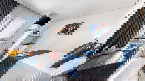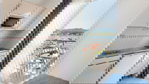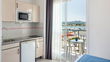 Studio uitgerust uitgerust met airconditioning, complete badkamer, Satelliet-TV, veilig, een kitchenette, koelkast, magnetron en balkon met Uitzicht op Zee
